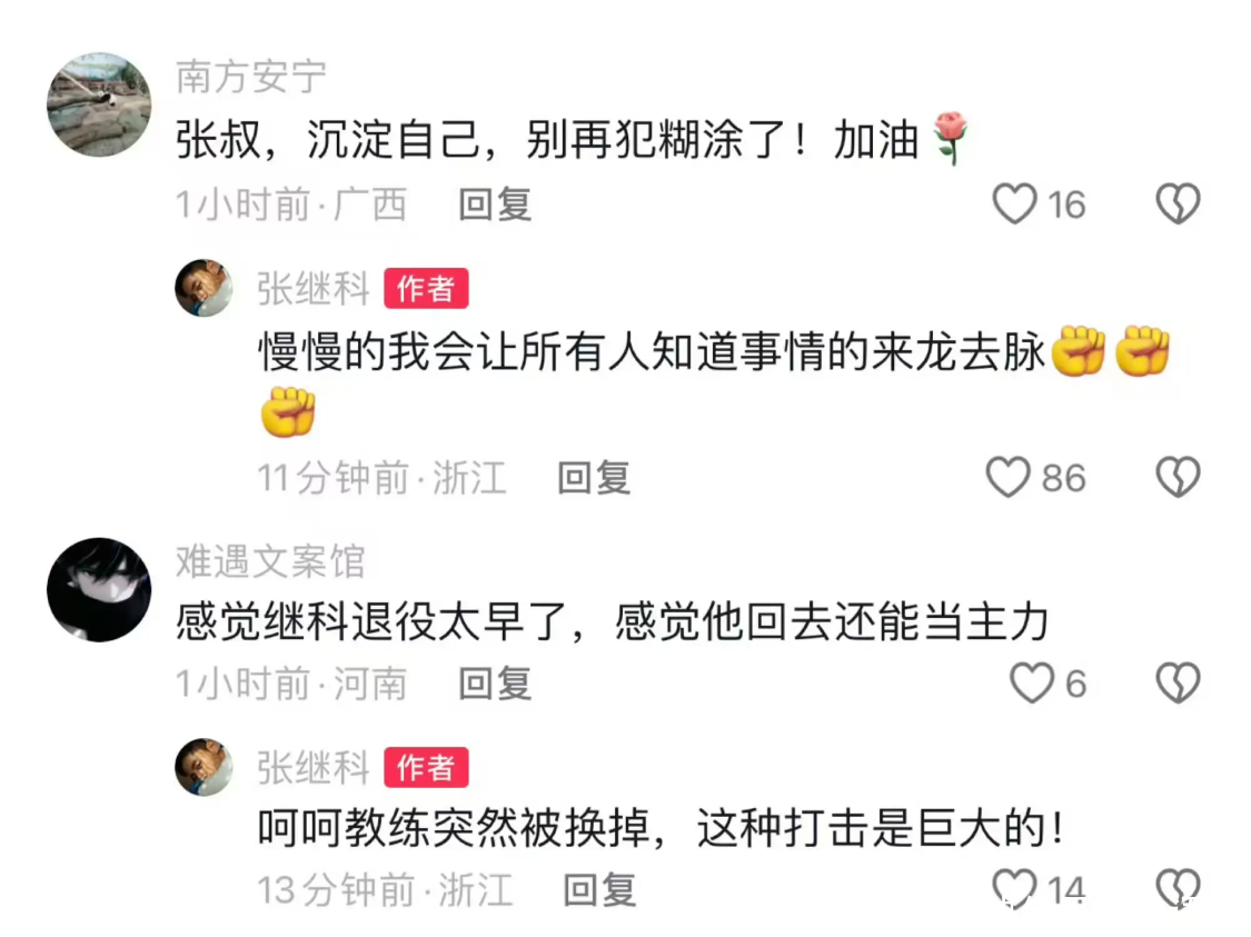 点击输入图片形色(最多30字)骨子上,这么一条老一又友之间的祝颂动态,却在商量区有了猛料。在这条动态的底下商量区,有球迷暗示:“张叔,千里淀我方,别再犯微辞了,加油。“看得出来,这是一位年青球迷对张继科的但愿,但愿张继科或者在今后有更好的发展。但没念念到的是,张继科给这位年青球迷的陈述,却是一条猛料:”冉冉的我会让整个东谈主知谈事情的来因去果。”