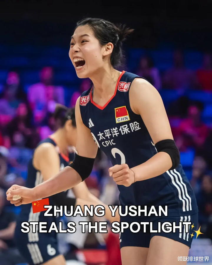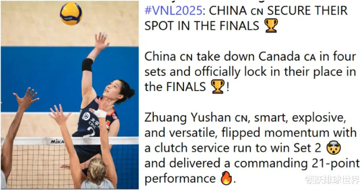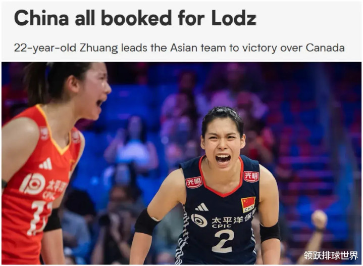 海外排联以大标题写说念:“中国女排预定了罗兹总决赛席位,22岁的庄宇珊换取亚洲劲旅打败加拿大”,并盛赞庄宇珊“颖异、爆发力强、时刻全面”,是这场顺利的关节人物。